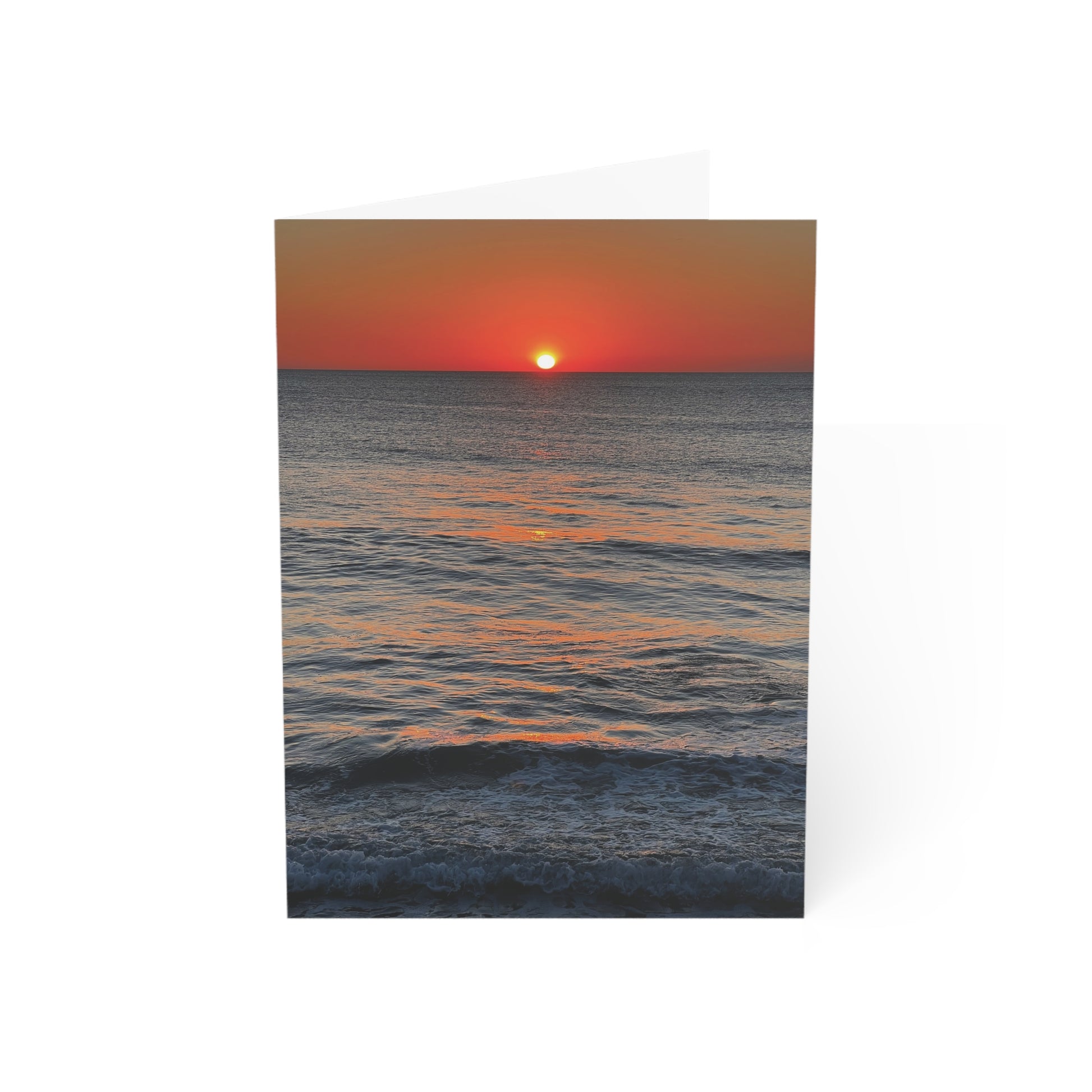 A set of premium greeting cards printed on sturdy white paper that features a print of an original Kind River Studio image of a stunningly pristine sunrise over the Atlantic Ocean. The back cover is a simple color match and our small logo on the back. The inside of the card is intentionally left blank for your own handwritten words. Perfect for any occasion, each card invites a heartfelt note. Consider it for a thank you, thinking of you, congratulations, new job, milestone acknowledgement, recovering from illness, or simply just because. Any reason is a good reason to send a beautiful card with a personal, handwritten note to brighten someone else's day.