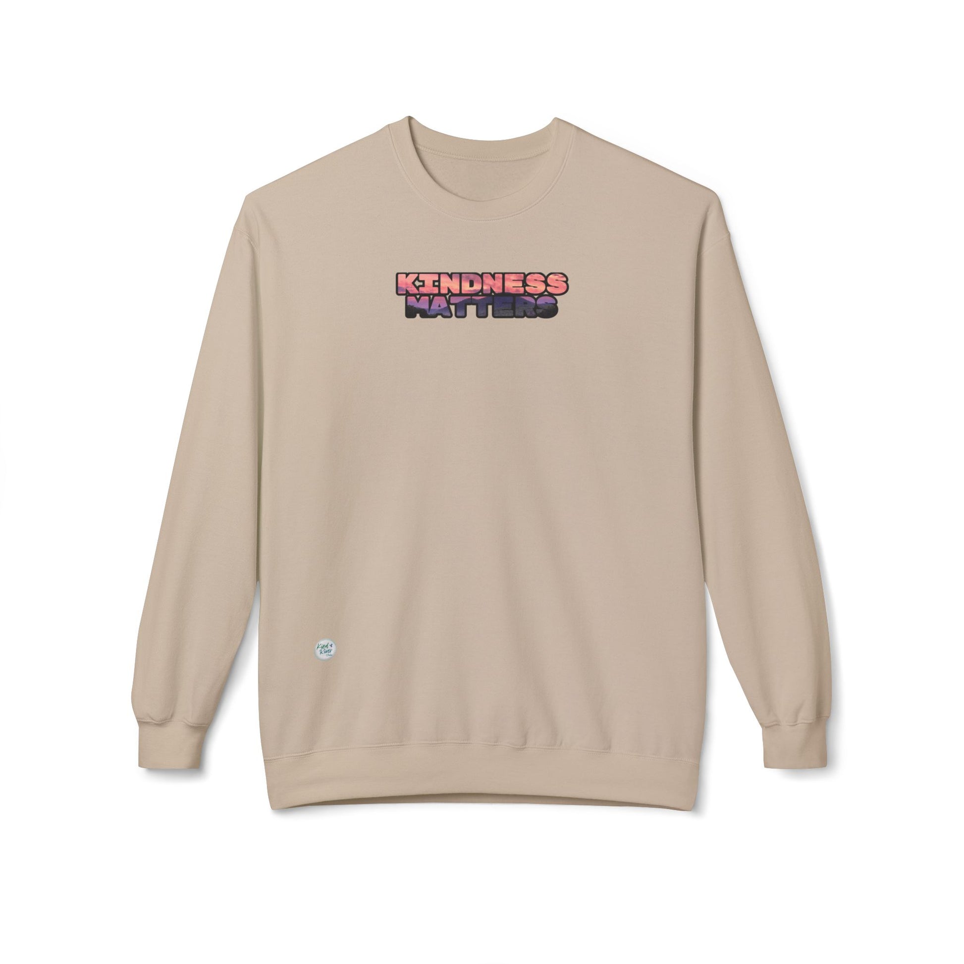 Soft, warm, and quietly expressive — this midweight Gildan crewneck is for people who prefer their statements gentle but meaningful. The Kind River Studio custom design is in small, hand-lettered-style print in the center chest reading “kindness matters” in layered, textured colors, holding space for reflection without shouting. The beautifully colored inlay background within the lettering is from a Kind River Studio original image of a mountainscape at dusk allowing for a uniquely colored design. The dropped shoulders and classic fit of this crewneck sweatshirt also make it easy to layer over a tee or wear on its own. It feels lived-in right away: a medium-heavy fabric with a brushed interior that keeps you comfortable while the ribbed cuffs and hem hold their shape. Wear it when you want to slow down, gather with friends, or walk through a neighborhood while carrying a calming message wherever you go.