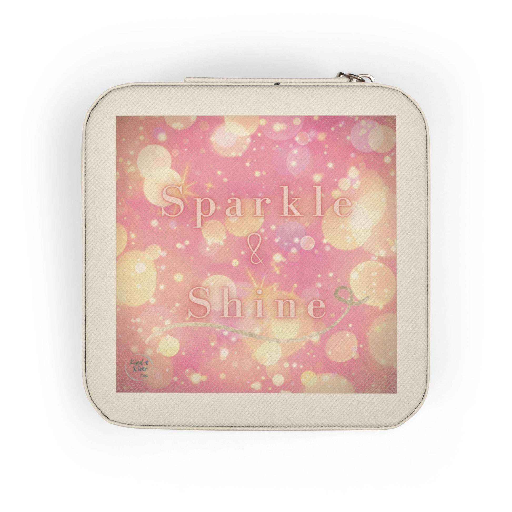 This charming Jewelry Travel Case is the perfect companion for the stylish traveler. The case is available in ivory or pink colors and Kind River Studio's original creative design enhances the top cover with its 'Sparkle & Shine'. With its compact size, the case effortlessly fits into your on-the-go bag or luggage, or perhaps your laptop bag if traveling for work, without taking up precious space and your jewelry is securely organized inside. The case features four divided compartments, ring rolls, and necklace hooks that keep your delicate pieces protected and tangle-free. Ideal for anyone who loves accessorizing and wants to be able to do so when away from home. This travel case also makes a thoughtful gift for special occasions such as birthdays, anniversaries, or holidays. Elevate your travel experience and keep your jewelry perfectly safe travel-ready with this stylish accessory!