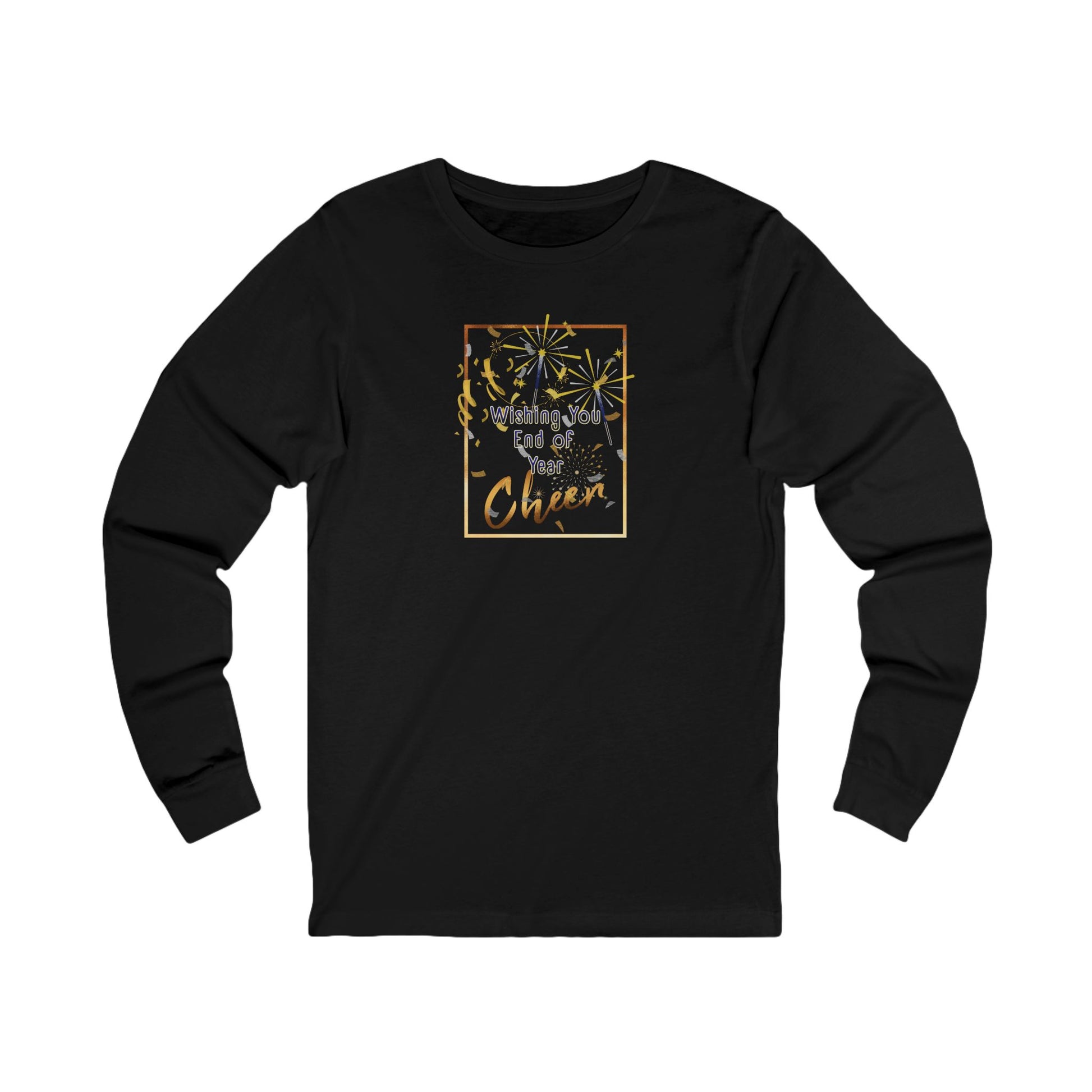 A lightweight long-sleeve tee that brings gentle holiday charm without the bulk. Celebrate the holiday season and festive spirit with this Bella+Canvas unisex long sleeve tee, designed to bring a smile to any holiday gathering. Kind River Studio's custom graphic design on the front only of a celebratory 'Wishing You End of Year Cheer' adds a touch of festive ambiance and joy, perfect for family get-togethers, holiday parties, or cozy nights by the fire. Made from Airlume combed and ring-spun cotton (fiber blend varies by color), the retail-fit shirt sits close to the body but remains breathable — great for layering under a cardi, light jacket, or blazer (to stylishly dress it up a bit) or wearing it alone on cooler days/evenings. Thoughtful details like ribbed collar, shoulder tape, side seams and a tear-away label keep the shirt looking crisp and comfortable after many wears. With subtle branding, it keeps the design clean while reminding you of a quality tee. This tee is for people who want a calm, cozy holiday vibe and a tee that's easy to wear again and again. It's ideal for those who cherish the season's festivities, making it a thoughtful gift for friends, family, or anyone looking to spread holiday cheer. It pairs beautifully with everything from jeans to lounge pants, or can even be dressed up with a blazer or cardi and some accessories for a festive event or outing! Perfect for all of year's end events, New Year celebrations, or even as a present to usher in the spirit of giving, this tee is a must-have for the holidays.