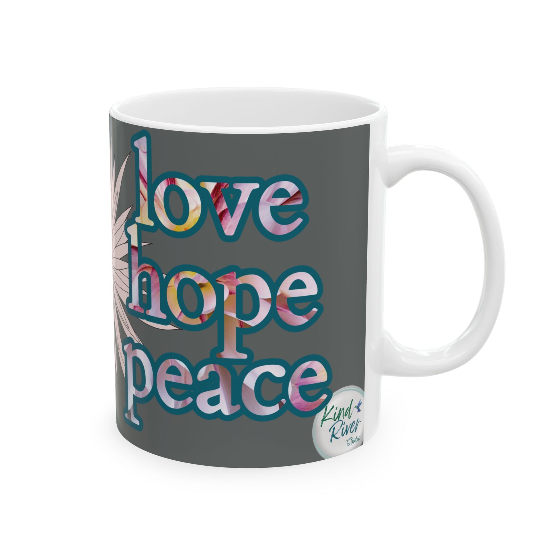 A Kind River Studio custom design of the message 'love hope peace' in bold serif font on a deep gray background on a smooth, white ceramic mug (11oz or 15oz). Additionally, it has a simple floral graphic and the words' inlay background contains an original Kind River image of two brightly colored dahlias to add a unique image and color to this special mug. With the graphic design and an uplifting statement message we hope it will bring comfort to you or your loved one to start each day, greet an afternoon, or cozy up at day's end. Whether you're a coffee, tea, warm water with lemon, hot cider, or hot cocoa enthusiast, this mug combines a pop of color with functionality and a warm, comforting aesthetic, featuring vibrant colors and a glossy finish. Its durable design ensures it will be a go-to mug for years to come.
