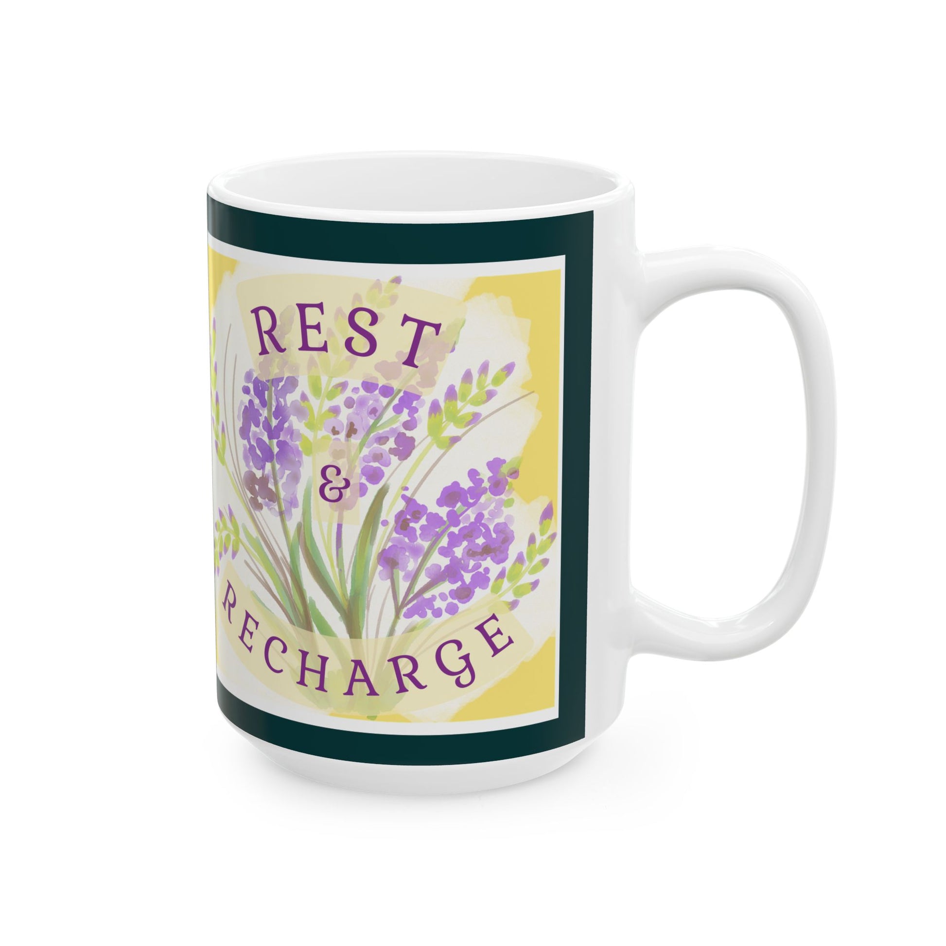 A lovely, calming, ceramic mug in two sizes designed to brighten your day with every sip with its lilacs and a soothing reminder to rest & recharge. This mug combines functionality with pleasing aesthetics, featuring vibrant colors and a glossy finish that beautifully showcase the design. Whether you're enjoying your morning coffee or a cozy evening tea, this mug brings a sense of warmth and joy to your routine. It's perfect for anyone who appreciates artful objects in their kitchen or office, making it a thoughtful gift for friends, family, or even yourself. We must remember to rest & recharge in between all of life's things. Let this mug speak to you. Or let it speak for you when you gift it to a loved one that treasures their quiet time, or as a thoughtful gift for a teacher, coach, or coworker who is in go-go-go season. Celebrate life's moments, whether it’s a birthday, holiday gathering, or a quiet evening at home, with a mug that speaks to your personality and style. Its durable design ensures it will be a cherished part of your go-to mugs for years to come.