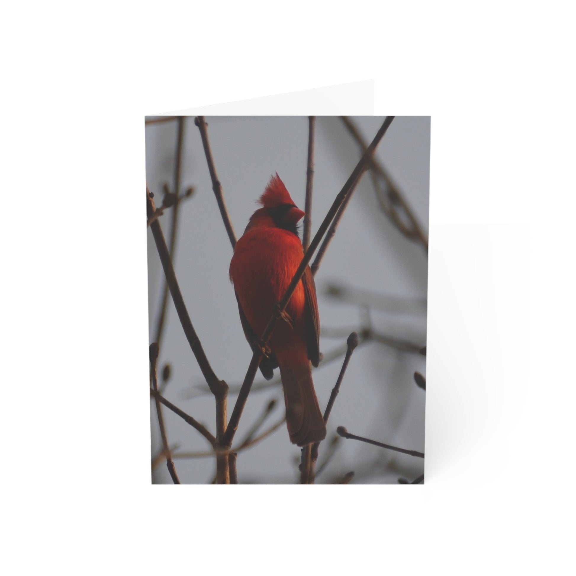 A set of premium greeting cards printed on sturdy white paper that feature a print of an original Kind River Studio image of a male cardinal bird on a bare tree branch in winter. With a beautiful red cardinal on the front and our small logo on the back, the inside of the card is intentionally left blank for your own handwritten words. Perfect for any occasion, each card invites a heartfelt note. Consider it for a thank you, thinking of you, sympathy, seasons greetings, or for the winter holidays. Any reason is a good reason to send a beautiful red cardinal with a personal, handwritten note to brighten someone else's day.