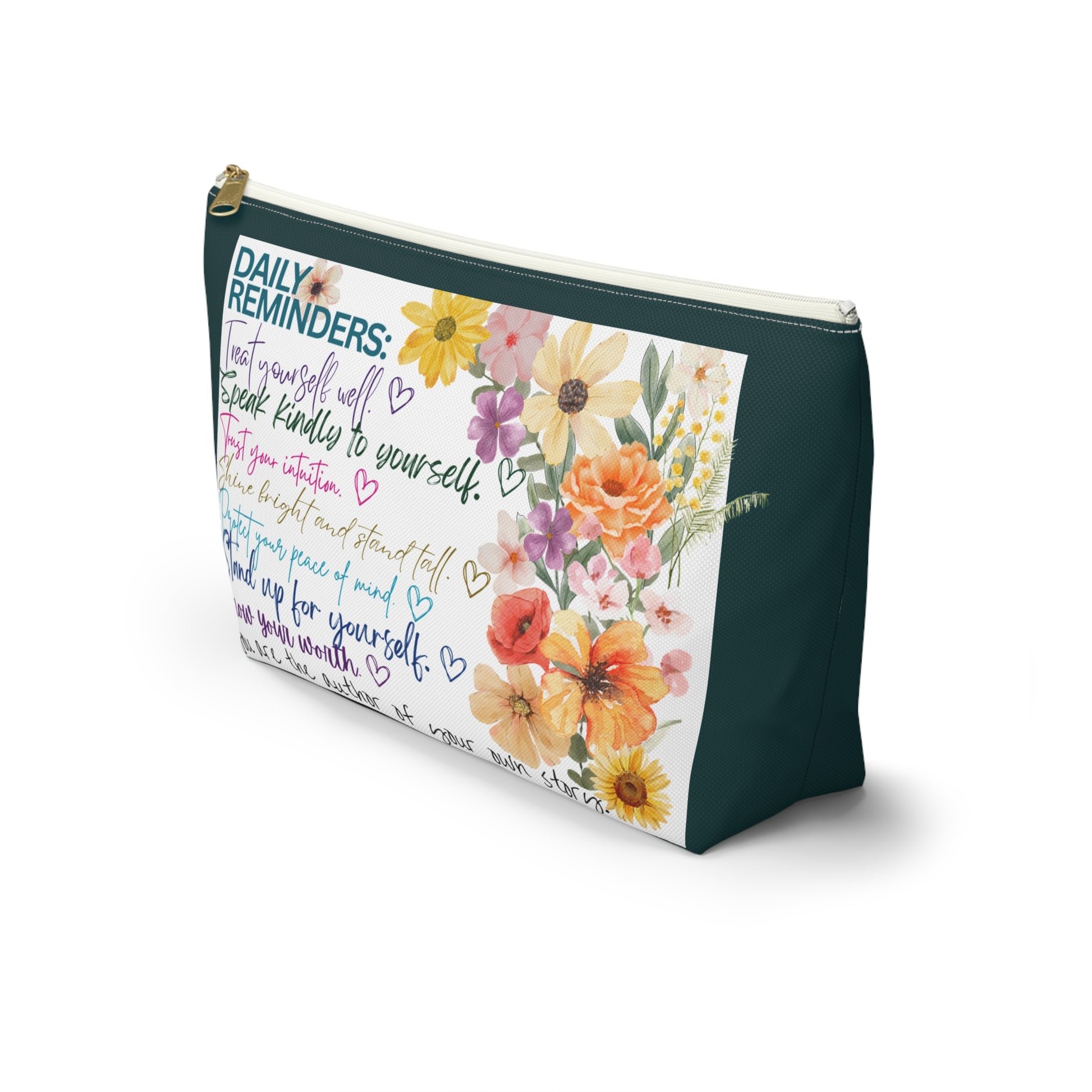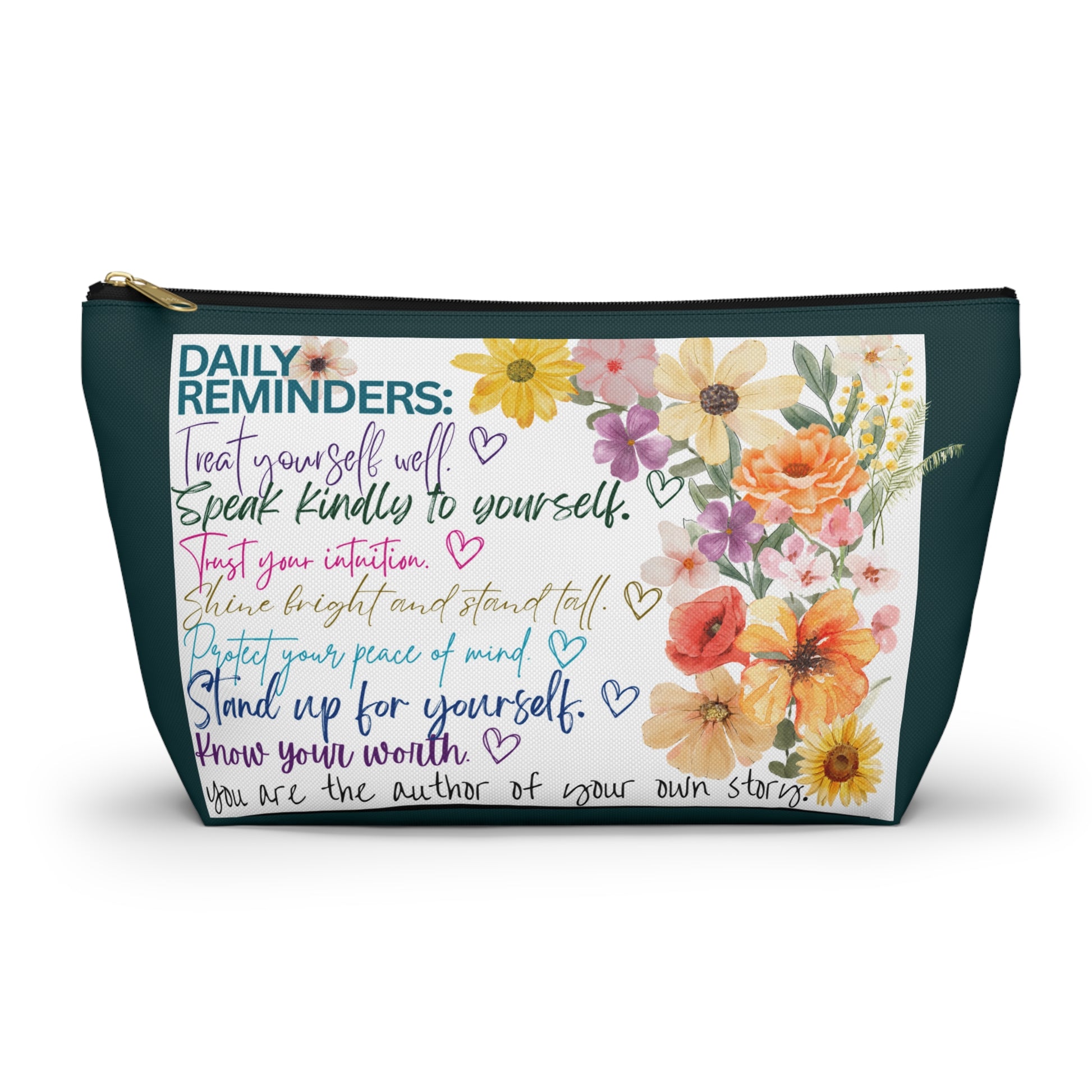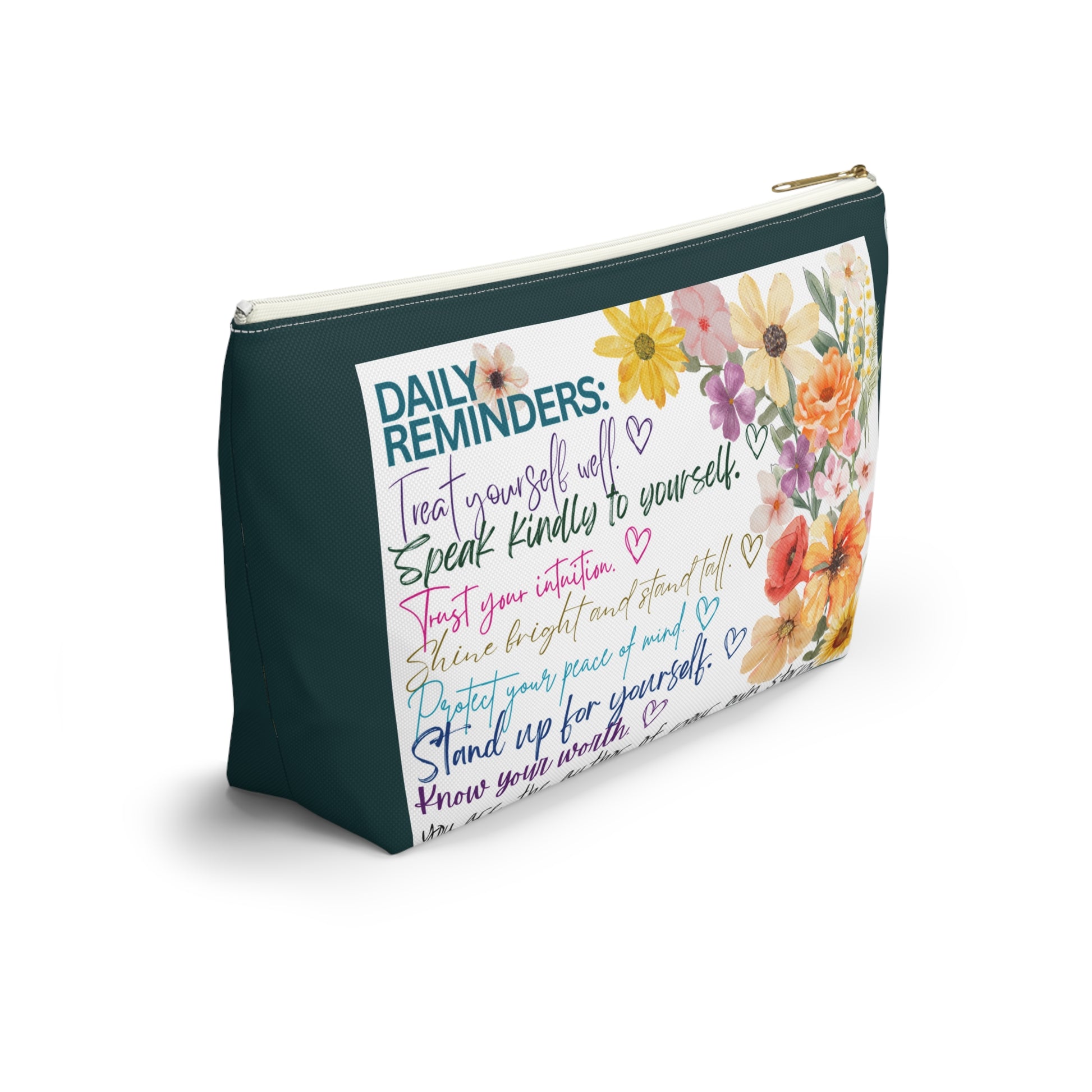 Elevate your organization game with this stylish Accessory Pouch. Crafted from durable spun polyester, it holds its shape beautifully, making it the perfect companion for your daily essentials. The vibrant colors pop with clarity thanks to advanced printing techniques, aligning perfectly with your unique style. This pouch is not just a practical item; it adds a cheerful vibe to your life, bringing joy whether you’re at home or on the go. Ideal for everyone to treat themselves as well as they treat the most favorite people in their lives. For loved ones, professionals, students, or anyone who needs a pick-me-up or just a reminder that they are valued every day. For one who appreciates a touch of organized flair and daily reminders in their accessories. This pouch is perfect for gifting or as a thoughtful just-because treat for you because we all need these reminders to be better to ourselves because life can be hard enough. Embrace the spirit of organization with a hint of positivity and a better start to each day!