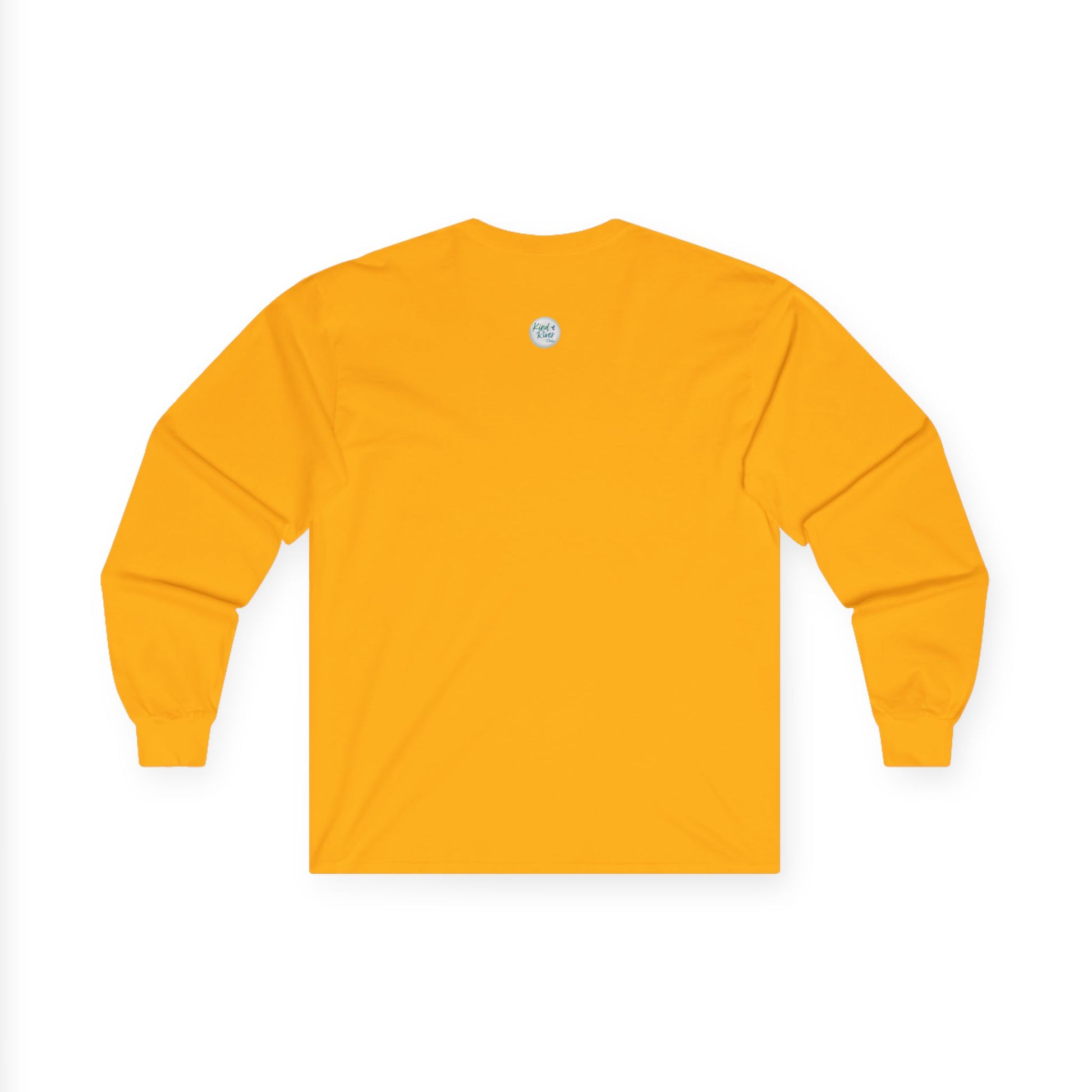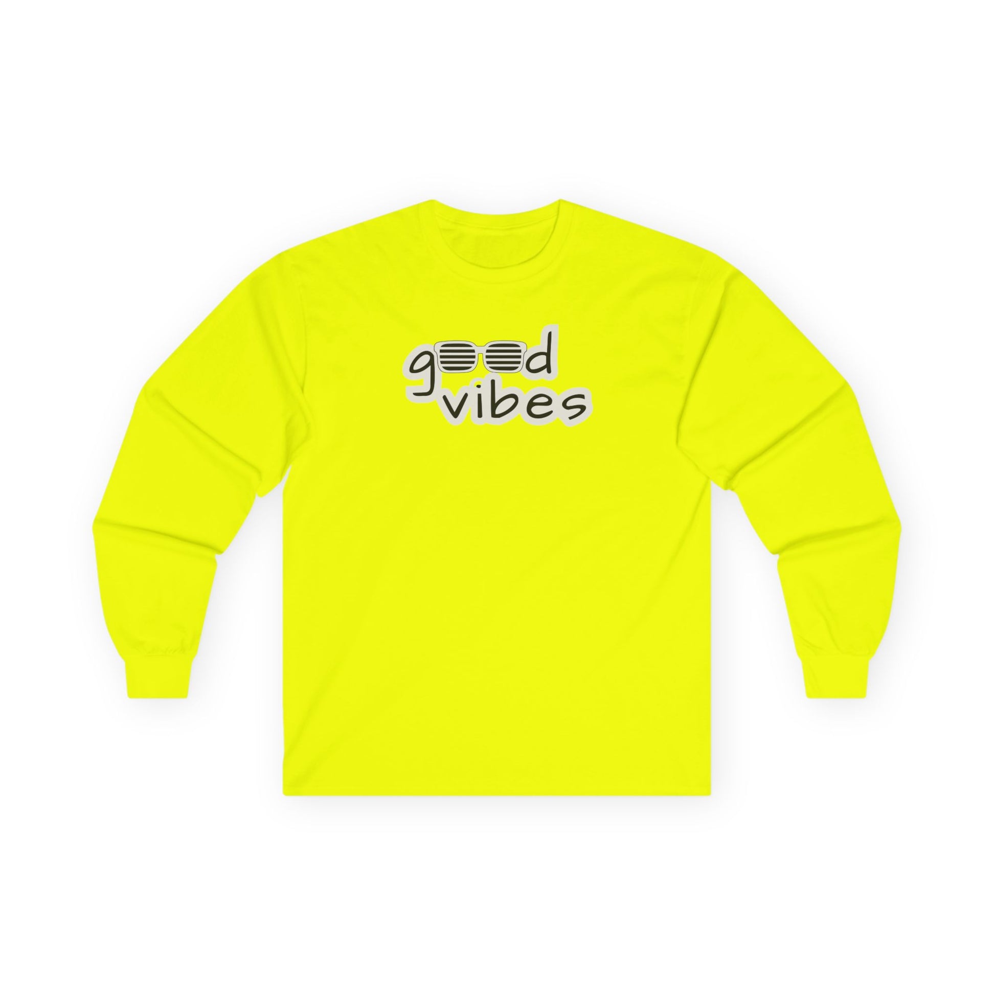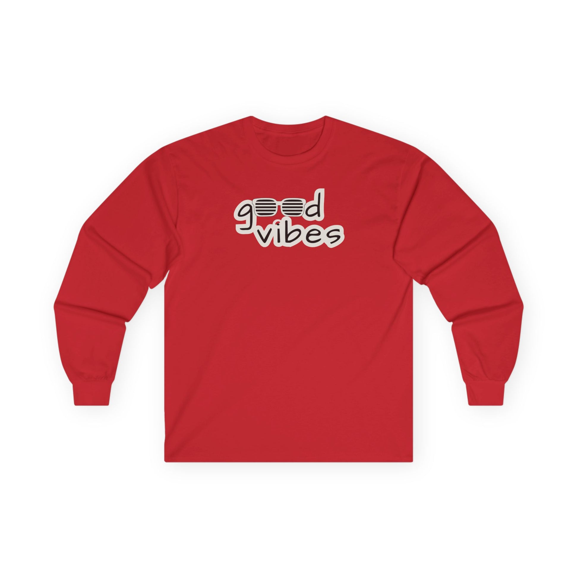 Good Vibes Long Sleeve Tee | Soft, slightly vintage Gildan long-sleeve tee with an original Kind River graphic design reading ‘good vibes’ across the chest in a laid-back style. The thicker, environment-conscious cotton and tubular knit give this shirt a lived-in feel from day one — the kind you reach for when you want comfort with an optimistic message. The ribbed collar and taped shoulders keep the silhouette tidy through repeated wear. Worn alone on cool days or layered under jackets, it sits comfortably in the wardrobe of someone who moves between coffee shops, evening walks, and low-key hangouts. The classic fit and understated graphic let the wearer broadcast calm energy without shouting for attention.