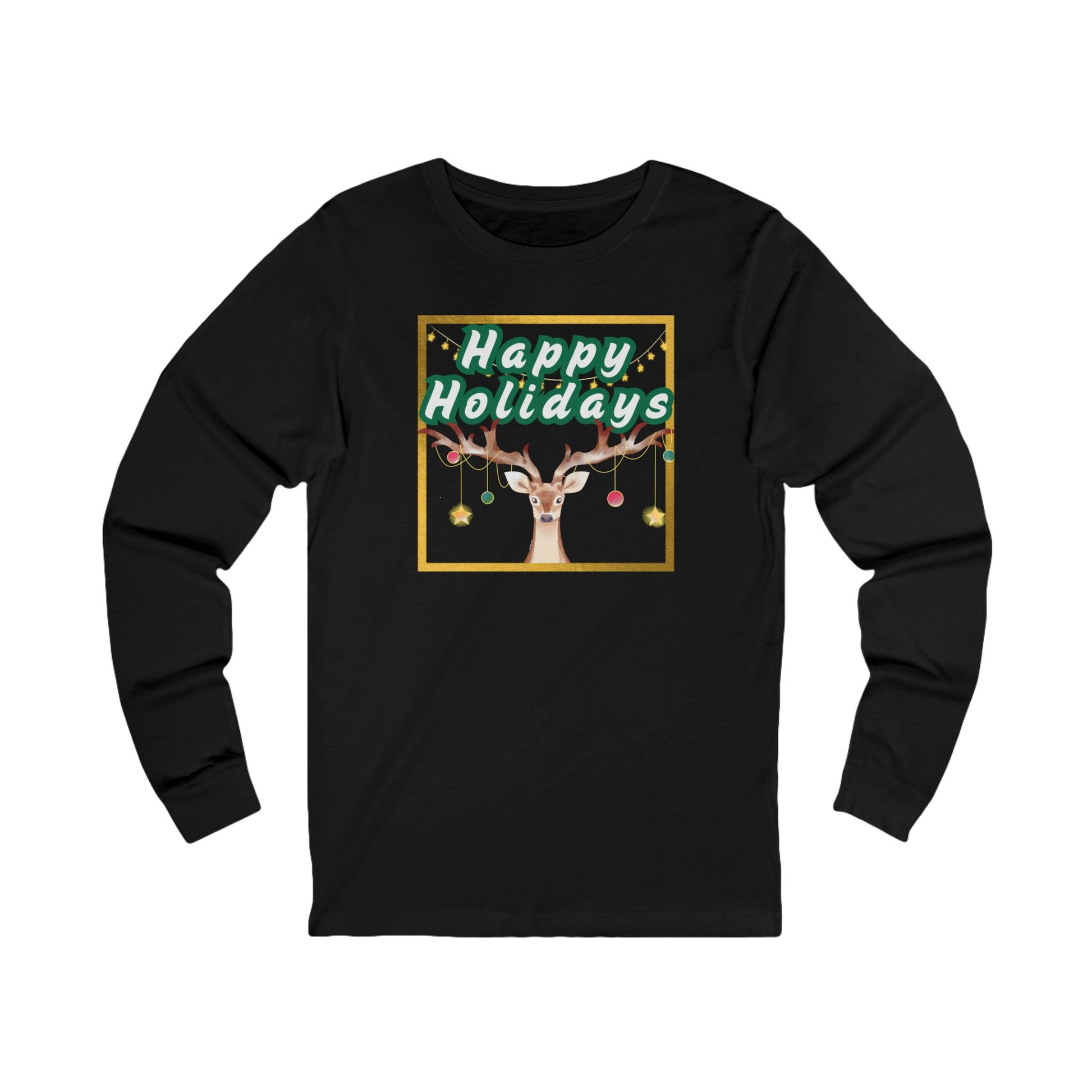 A lightweight long-sleeve tee that brings gentle holiday charm without the bulk. Celebrate the holiday season and festive spirit with this Bella+Canvas unisex long sleeve tee, designed to bring a smile to any holiday gathering. Kind River Studio's custom graphic design on the front only of the 'Happy Holidays, "Deer"' with ornaments and bright stars adds a touch of whimsy and joy, perfect for family get-togethers, holiday parties, or cozy nights by the fire. Made from Airlume combed and ring-spun cotton (fiber blend varies by color), the retail-fit shirt sits close to the body but remains breathable — great for layering under a cardi, light jacket, or blazer (to stylishly dress it up a bit) or wearing it alone on cooler days/evenings. Thoughtful details like ribbed collar, shoulder tape, side seams and a tear-away label keep the shirt looking crisp and comfortable after many wears. With subtle branding, it keeps the design clean while reminding you of a quality tee. This tee is for people who want a calm, cozy holiday vibe and a tee that's easy to wear again and again. It's ideal for those who cherish the season's festivities, making it a thoughtful gift for friends, family, or anyone looking to spread holiday cheer. It pairs beautifully with everything from jeans to lounge pants, or can even be dressed up with a blazer or cardi and some accessories for a festive event or outing! Perfect for Christmas, New Year celebrations, or even as a present to usher in the spirit of giving, this tee is a must-have for the holidays.