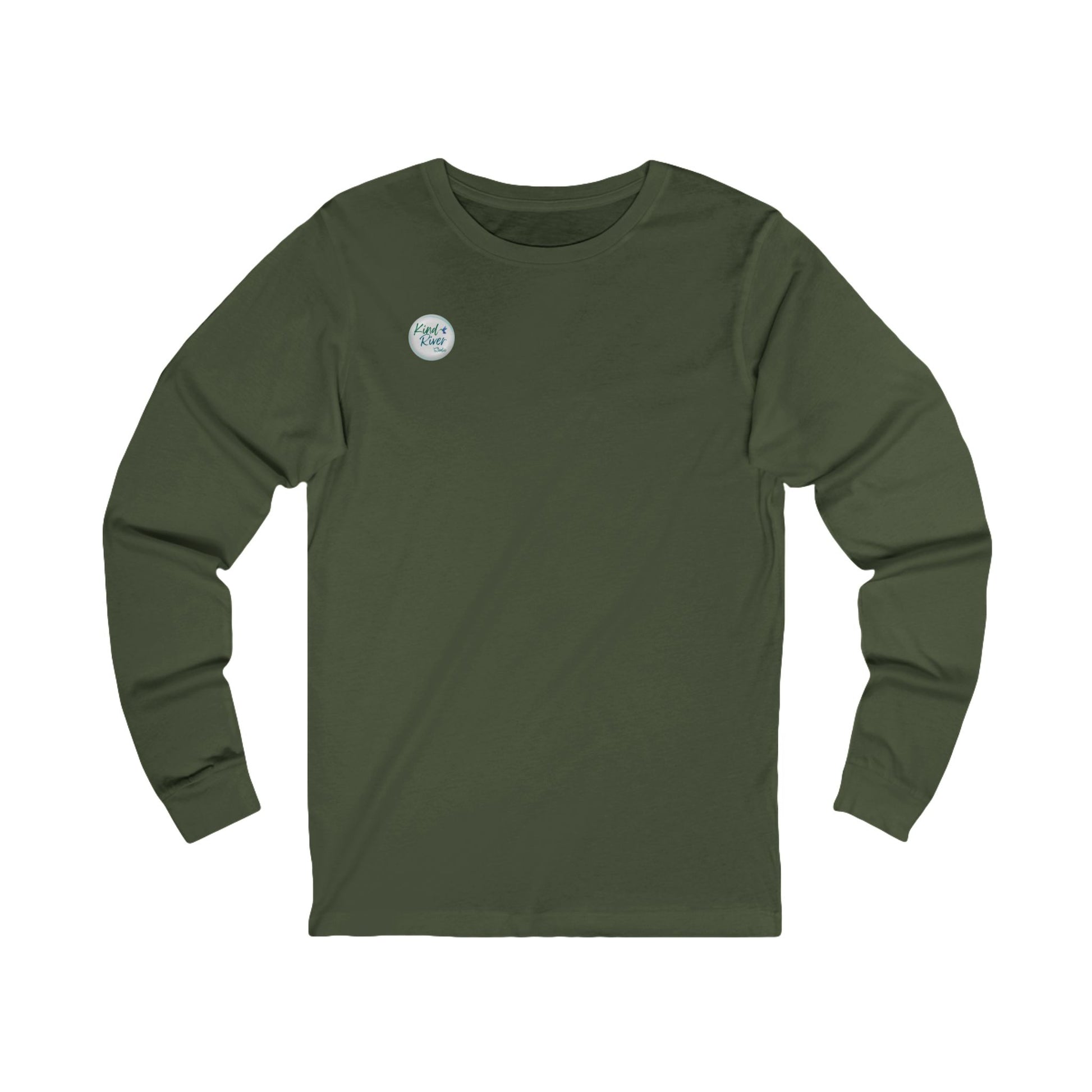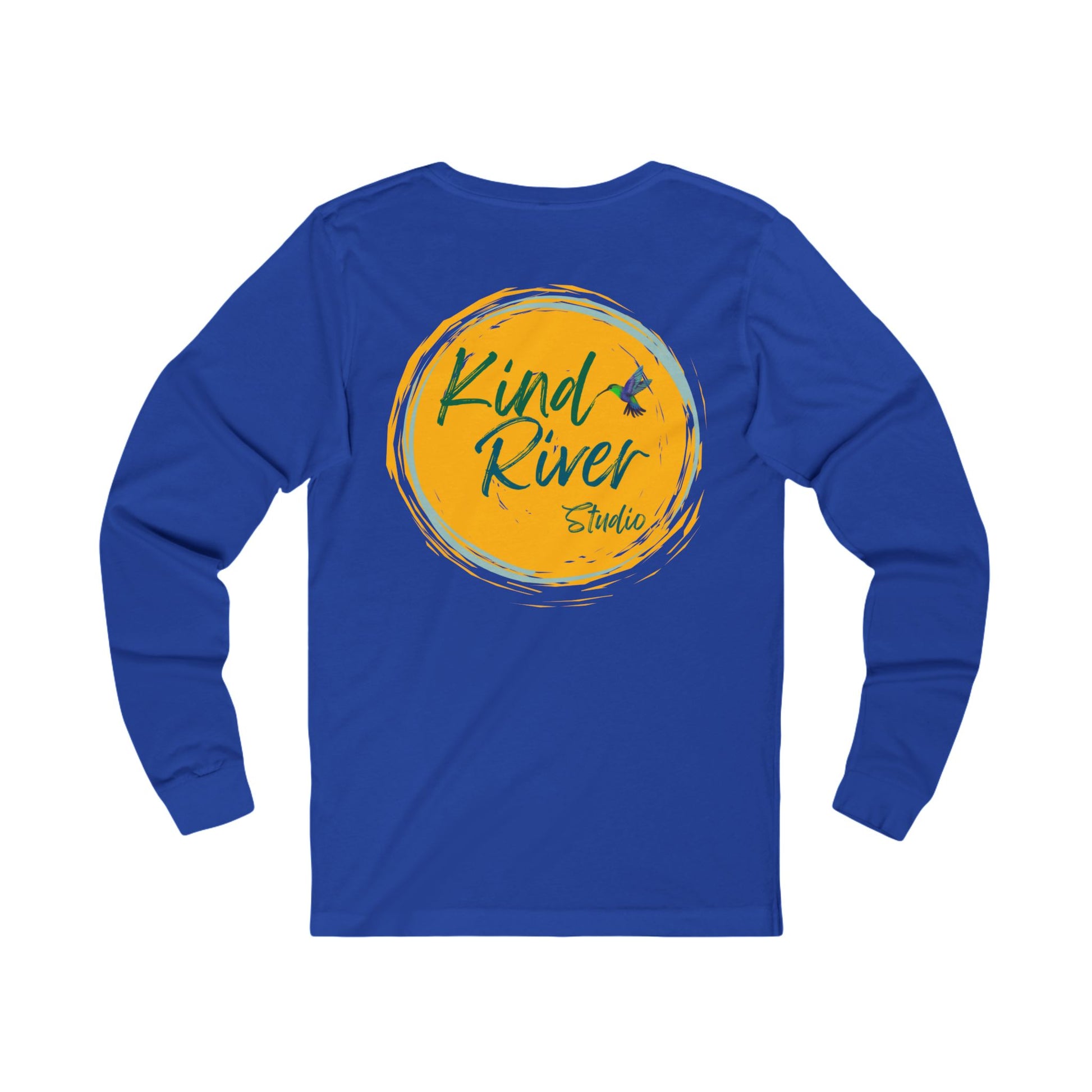 This Bella+Canvas versatile Unisex Jersey Long Sleeve Tee with our Kind River Studio small button logo on the front and a larger yellow sun button logo on the back, perfect for year-round wear. This stylish tee features a comfortable retail fit, making it an essential addition to any wardrobe. The soft, light fabric offers a breathable feel, ideal for layering or wearing solo. With its fun design and color options, it brings an easy, casual vibe to any outfit. Whether you're out for a daily errands, school drop off, friend meetup, or cozying up at home, this tee provides comfort and style, and it will quickly turn into one of those go-to tees for you!