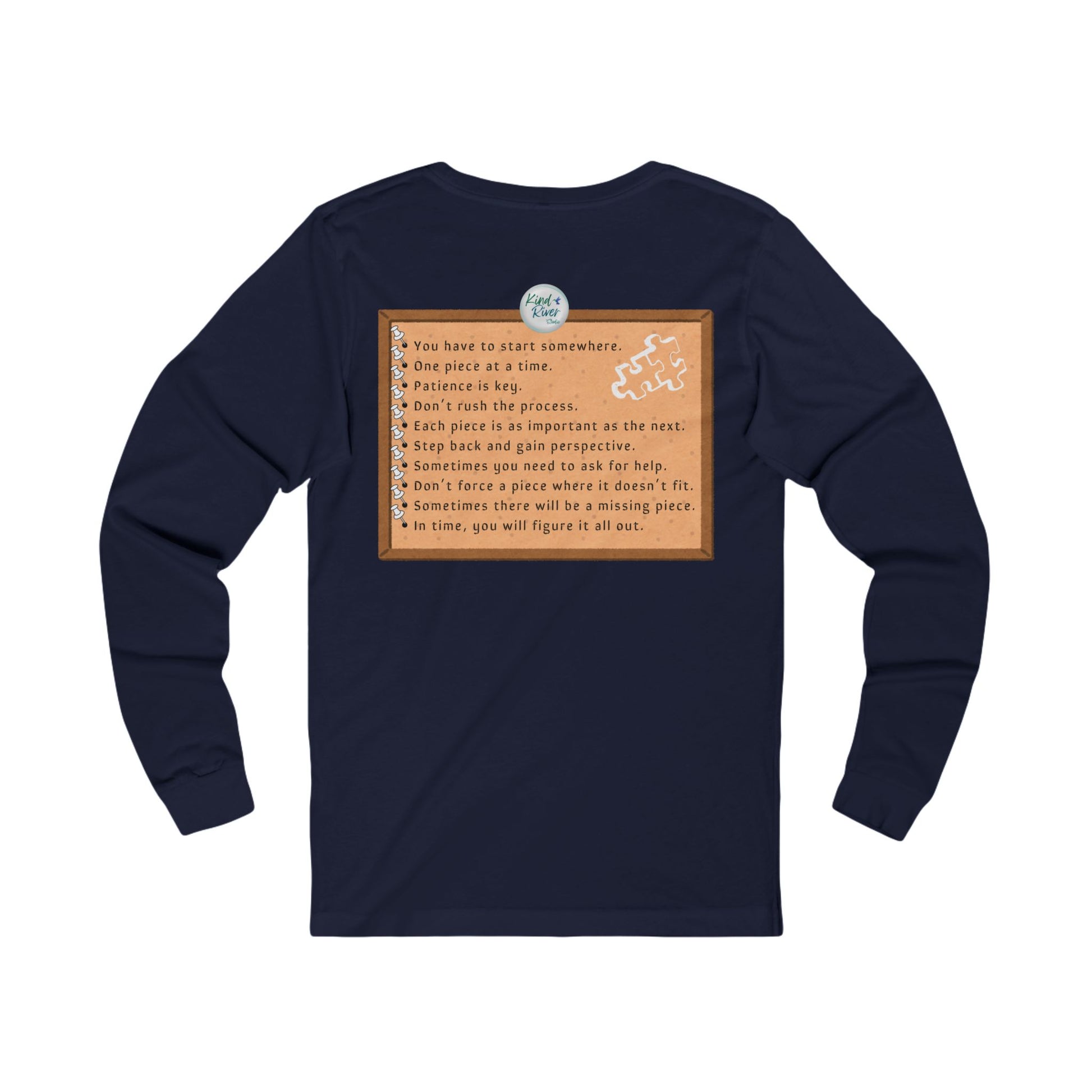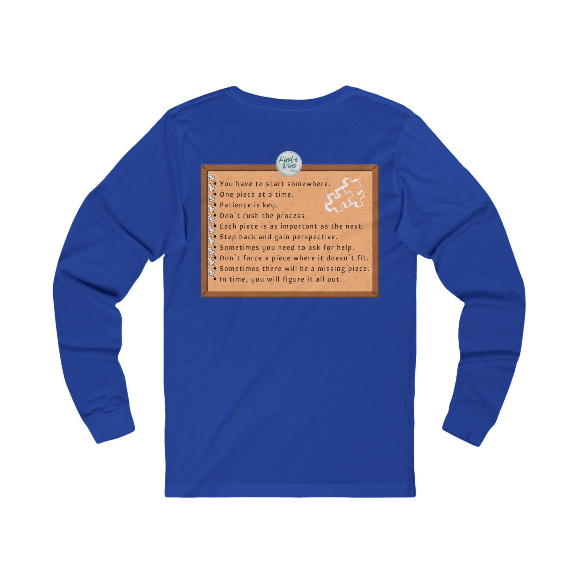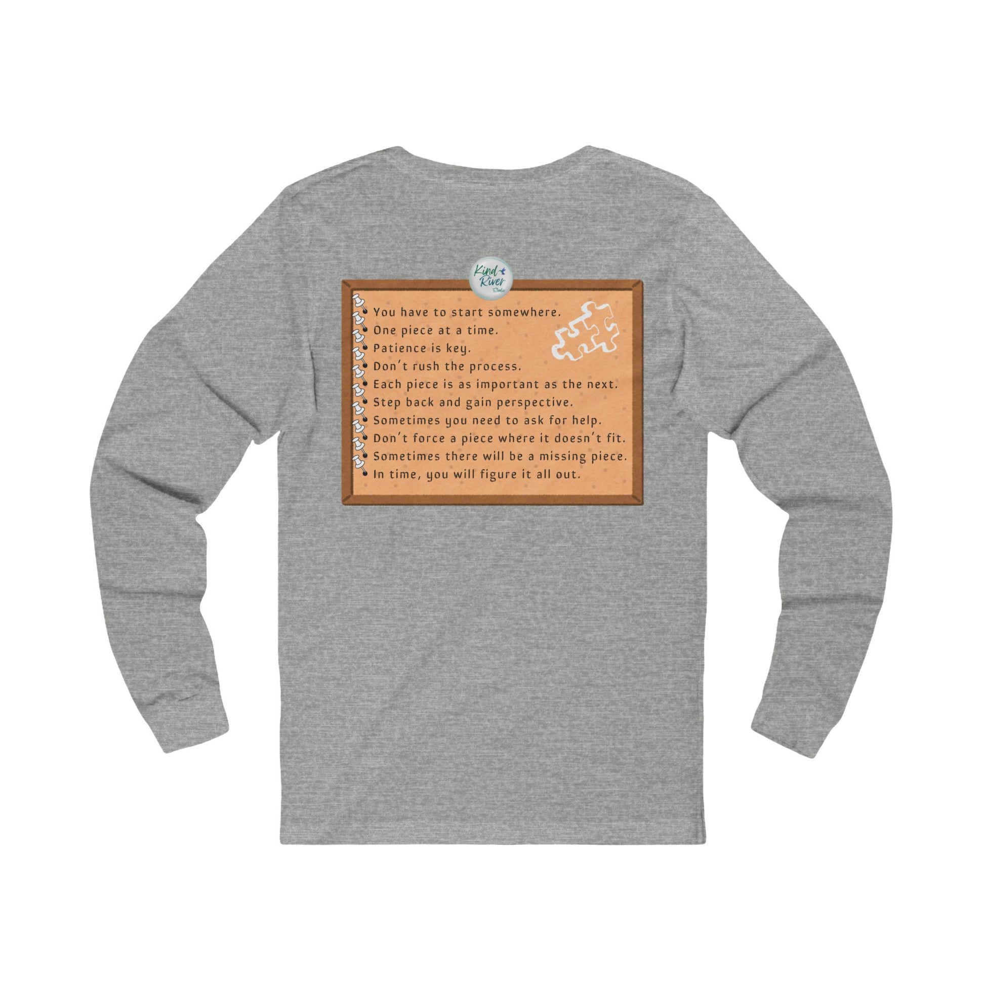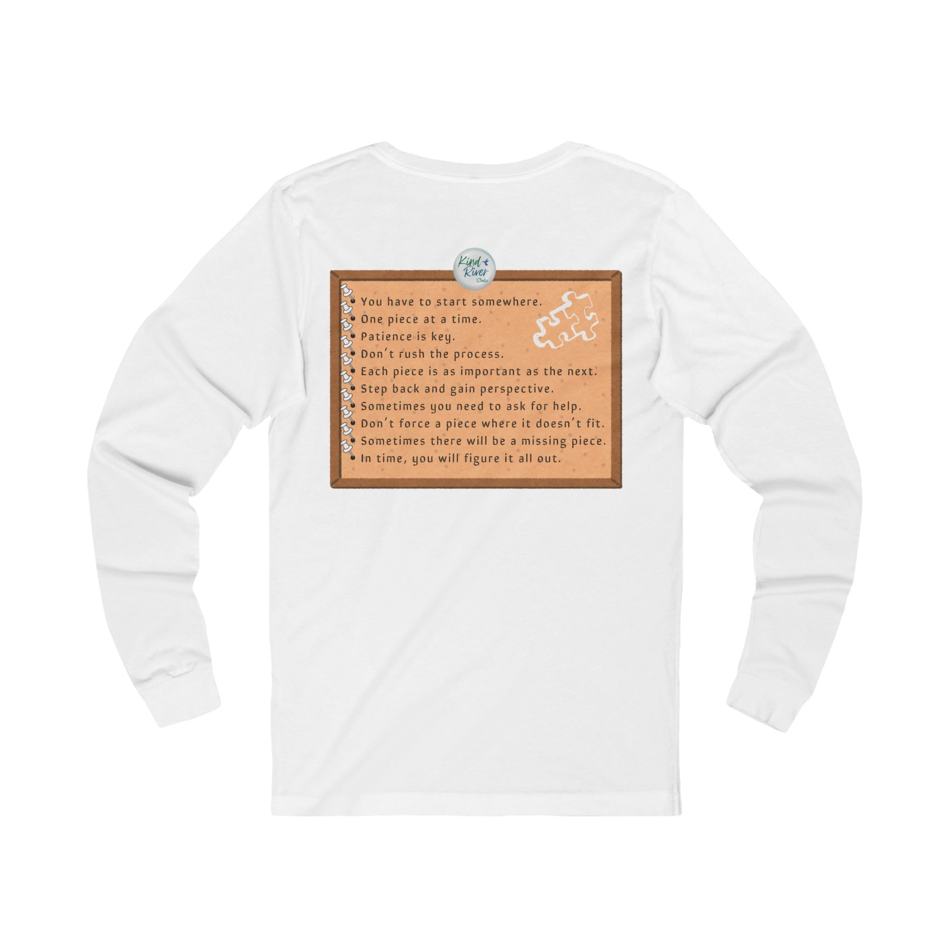 This Bella+Canvas versatile Unisex Jersey Long Sleeve Tee is perfect for year-round wear. This comfy tee features a comfortable retail fit, making it an essential addition to any wardrobe. The soft, light fabric offers a breathable feel, ideal for layering or wearing solo. It has bold graphics on both the front and back about life's puzzles. With its fun design and color options, this tee brings an easy, casual vibe to any outfit. Whether you're out for a daily errands, school drop off, friend meetup, serious jigsaw puzzle time, or lounging at home, this tee provides comfort and style. With fun, comfort, and life lessons, you can't go wrong with this tee - especially if you or someone you know is a jigsaw puzzle enthusiast!