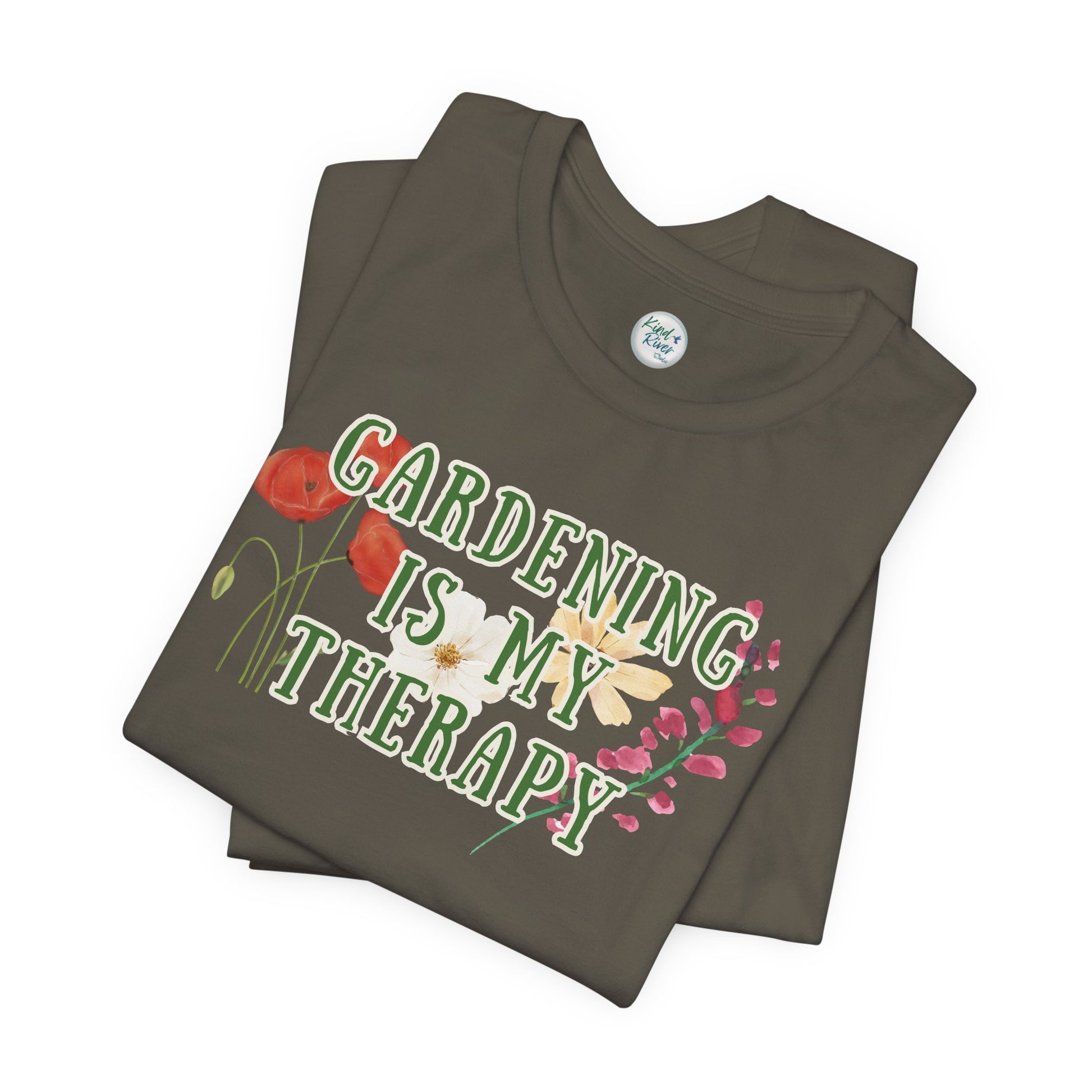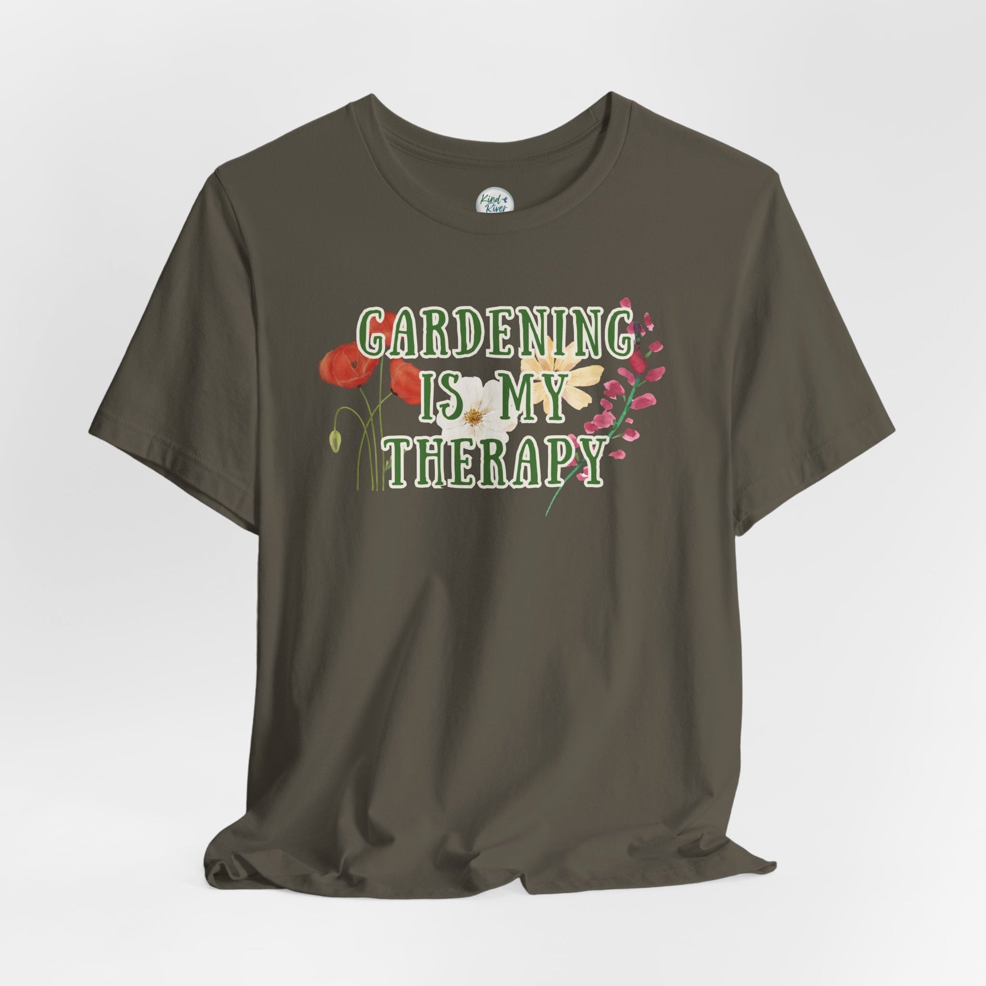 Lightweight and gently structured, this Bella+Canvas tee carries a clever, fun, subtle (and likely accurate) message about gardening being therapeutic for many reasons. It features a Kind River Studio custom graphic design on the front (back is blank) that "Gardening is my Therapy." We at Kind River Studio love gardening, beautiful gardens, and watching all of the various pollinators. Gardening tasks include exercising, cultivating, caretaking, propagating, nurturing, learning, being patient, and building confidence. Even more, it can simply be fun to relax and just play in the dirt! For many, gardening can sooth the soul, de-stress, and/or bring peace of mind. Some people even say they get lost in their gardens (in a good way)!