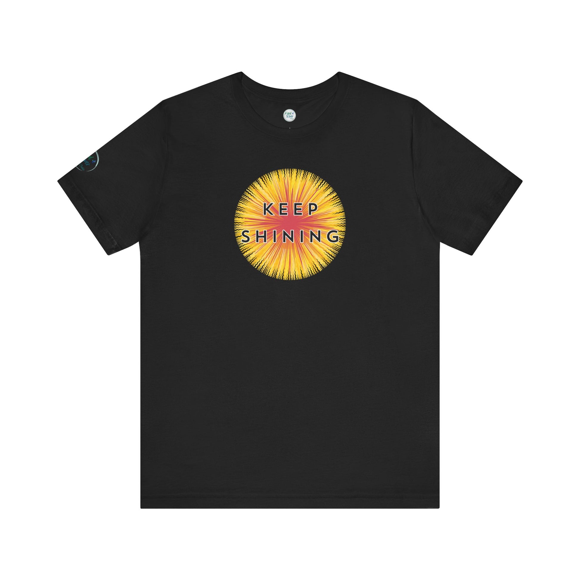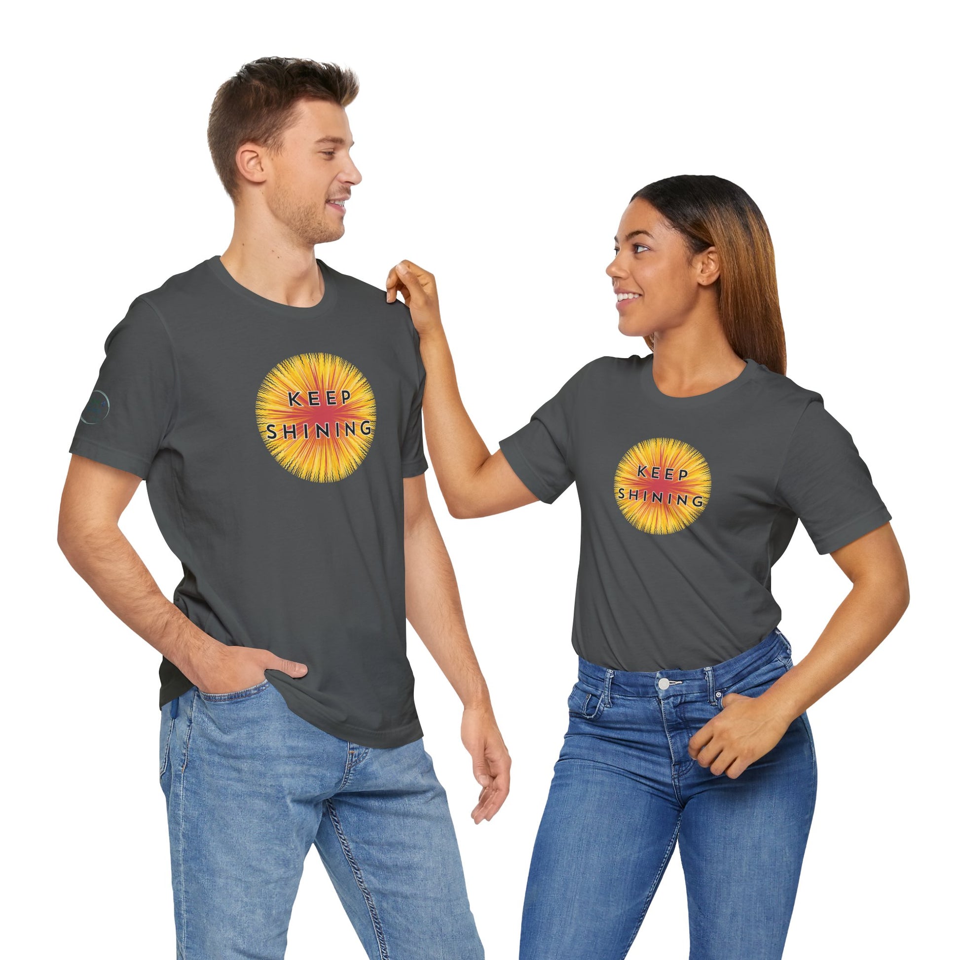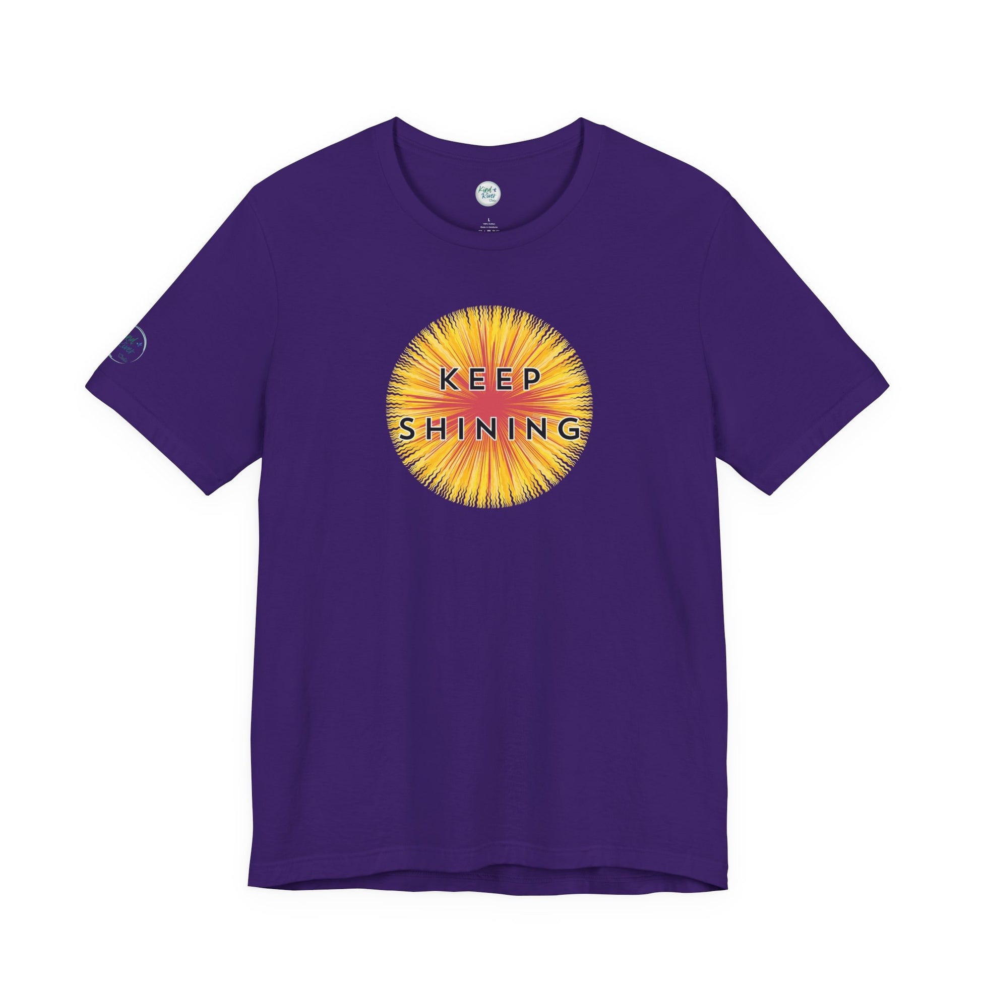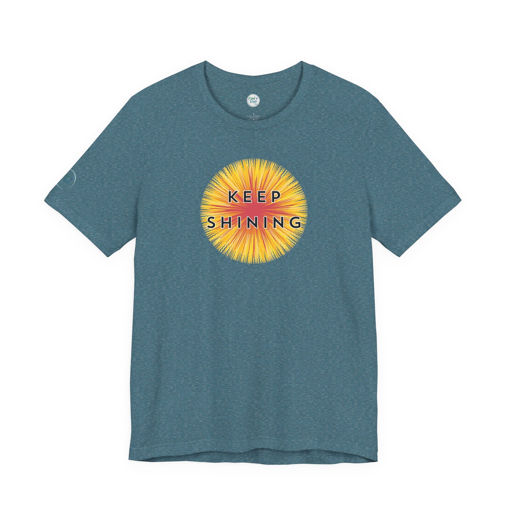 A stylish Bella+Canvas unisex jersey short sleeve tee with Kind River Studio's custom graphic design on the front to 'Keep Shining.' Don't let anyone dull your shine. A gift for yourself or a loved one. An uplifting message and good reminder to boost self-confidence and pay it forward. Comfy for casual, everyday wear or out layered and with added accessories to meet up with friends. Crafted from 100% Airlume combed and ring-spun cotton, this tee is not only breathable and lightweight but also provides a comfortable fit for both relaxation and casual outings. With its classic crew neckline and retail fit, it pairs beautifully with everything from jeans to lounge pants or layer it under a suitcoat with nice jeans and some jewels to even dress it up for a party or event!