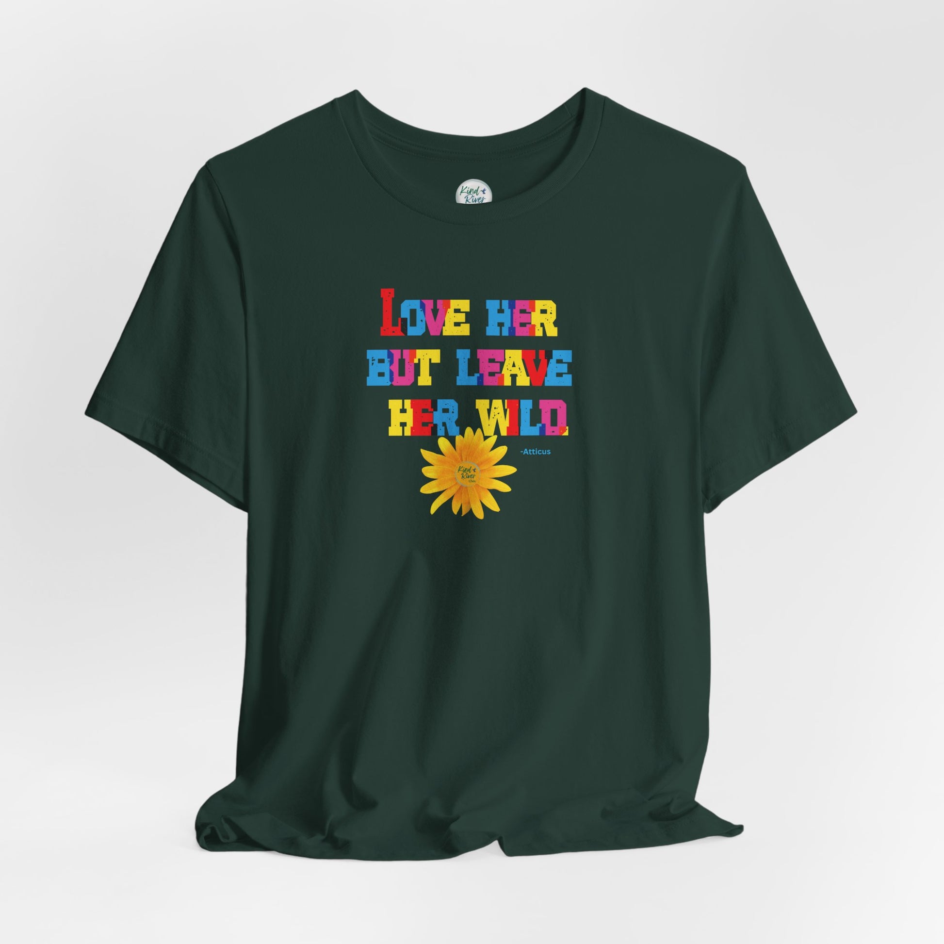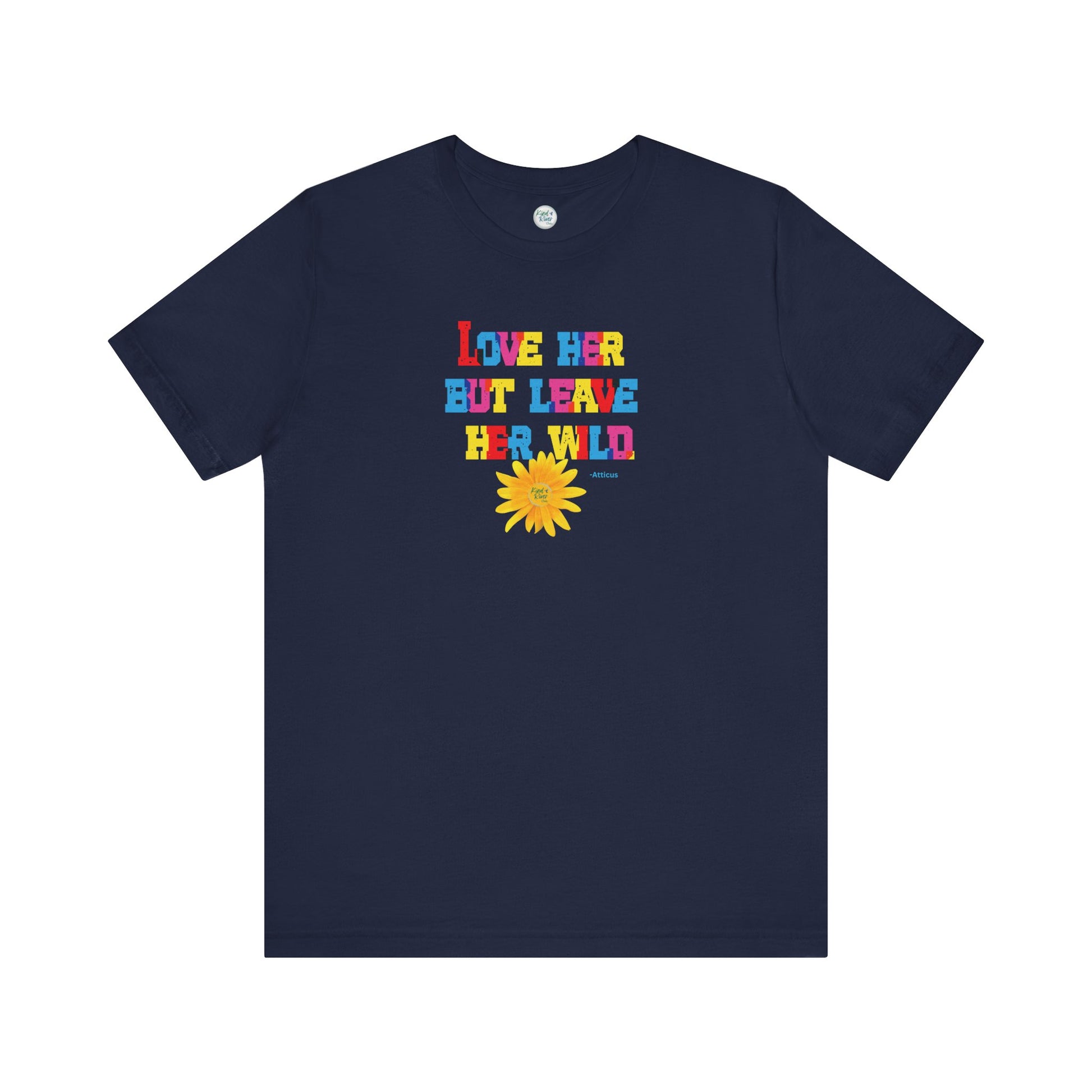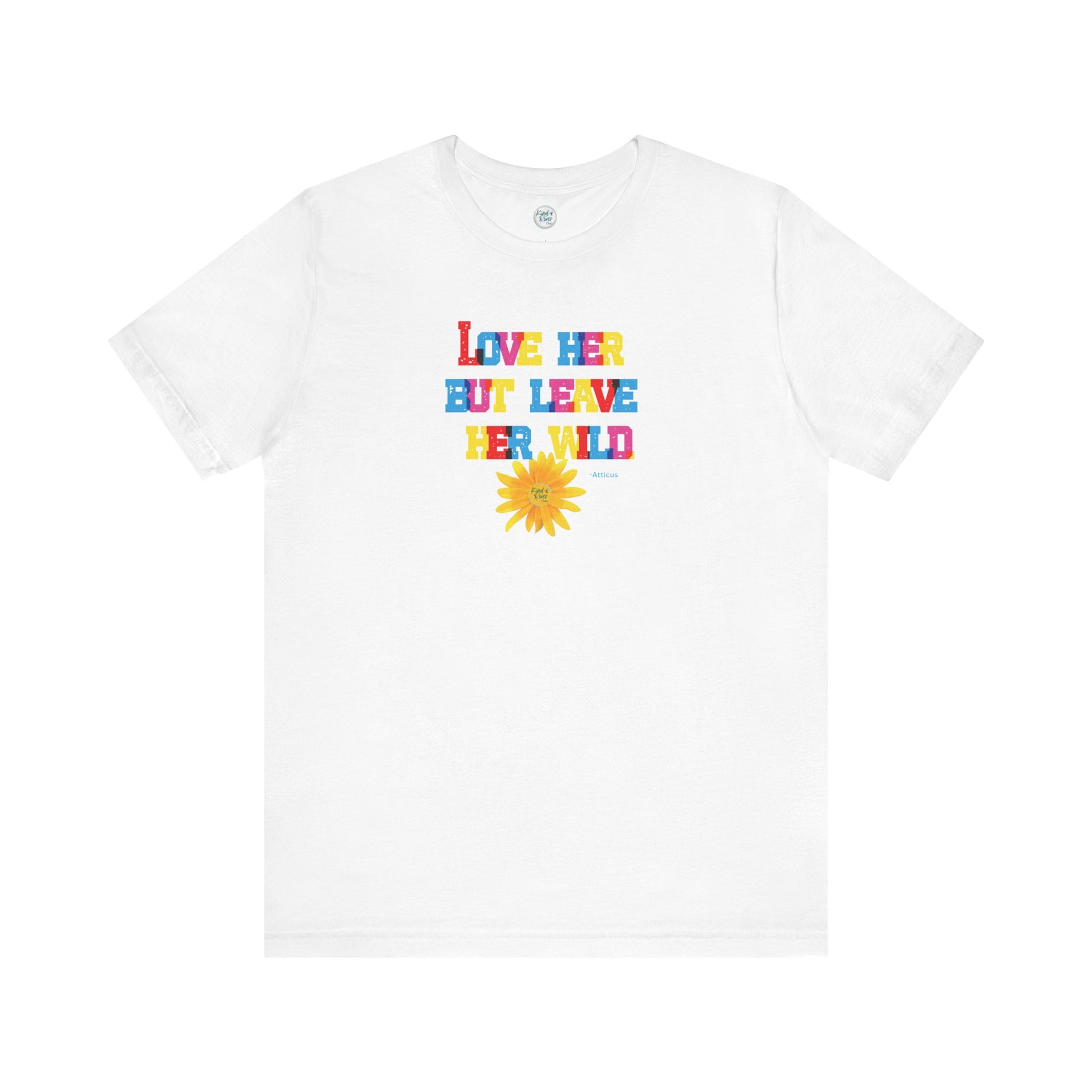 A comfy, soft Bella+Canvas tee with a centered, strong, bold Kind River custom colorful graphic featuring an epic quote by Atticus stating "love her but leave her wild." It also includes our very own photograph cut-out of a striking "wild" yellow daisy to match the vibe of this tee. With the vibe of loving her as she is by supporting her dreams and never diminishing her light, uniqueness, boldness, or unending strength. Loving who she is means sharing kindness over criticism. In a world where others' expectations, societal norms, or external pressures might urge her to be less to conform to certain standards, let's be that someone that wants her to shine and is always in her corner. This tee serves as a powerful reminder there is no one else like her in this world - she is one of one. To amplify her dreams, qualities, and strengths, to honor herself and inspire others to do the same, fostering a culture of kindness, support, empowerment, authenticity, and resilience. Pair this tee easily with various fits: (1) wear it solo as a statement tee; (2) wear it as a first layer under a flannel, cardi, or blazer; (3) wear it as a second layer over a long sleeve tee for added warmth. A pop of color with an uplifting message is a perfect tee for every day wear!